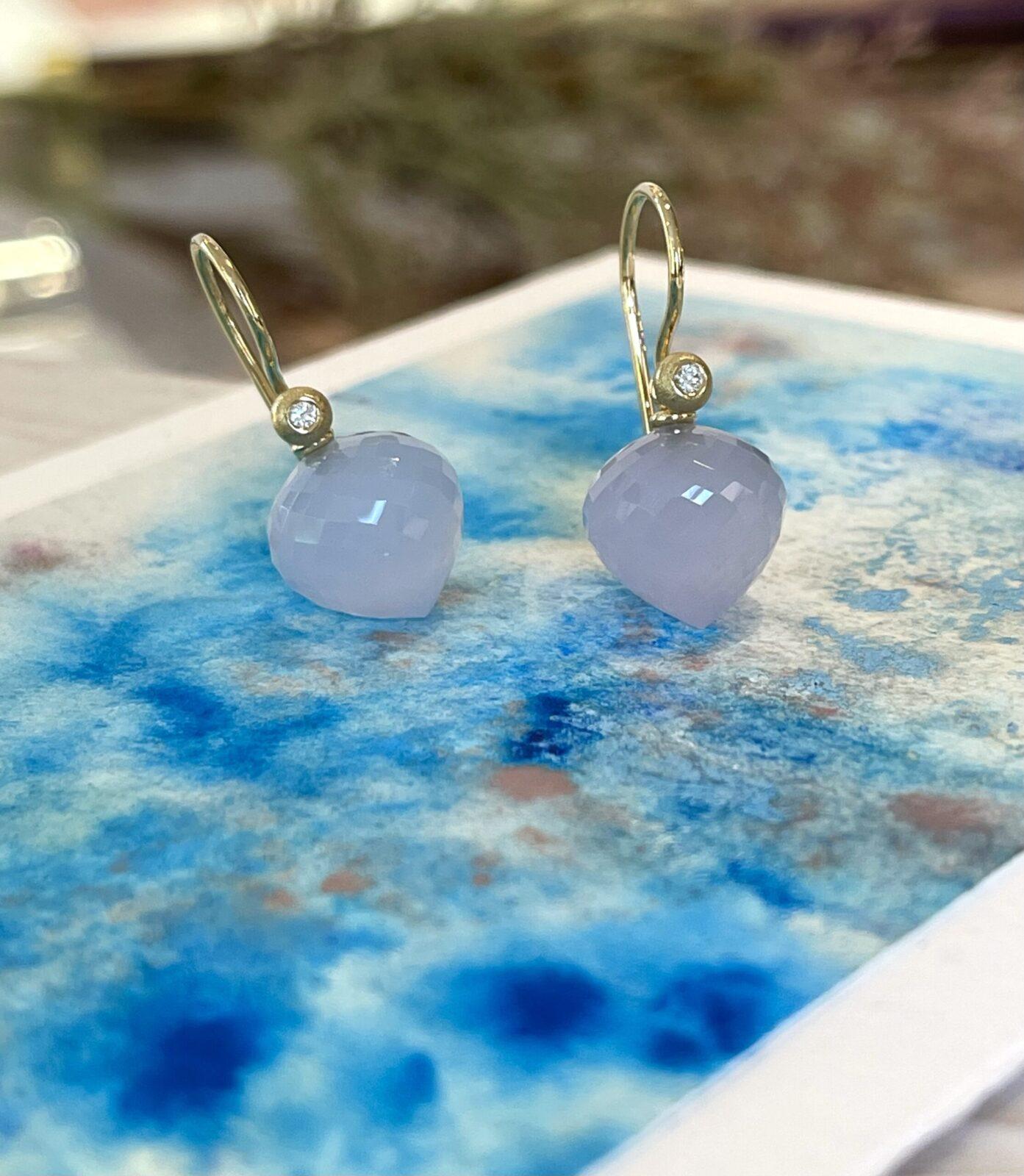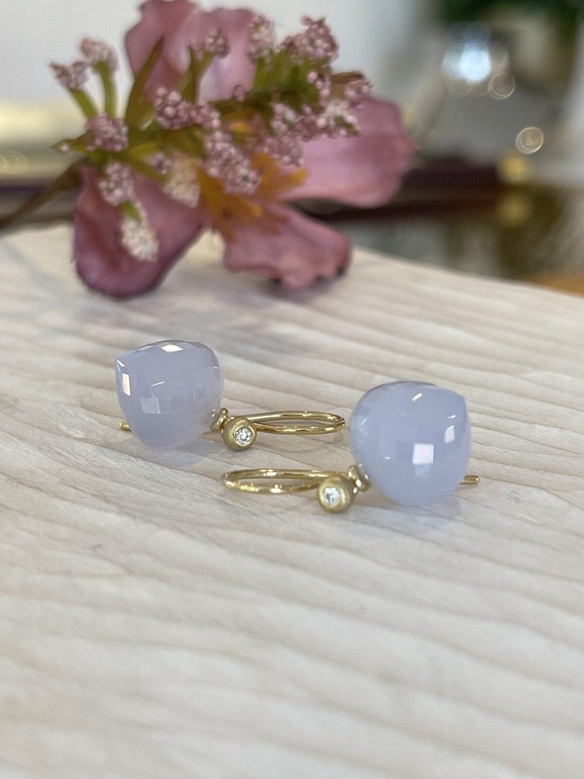 Chalcedonen in een lila/lichtblauwe kleur. Door de melkachtige glans en de facetten is de kleur in elk licht net even anders.