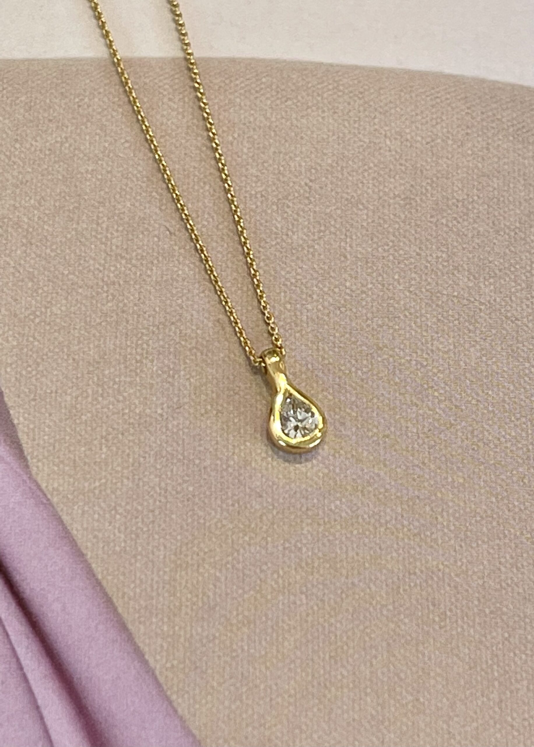 Goud en diamant is toch een magische combinatie. Er kunnen door verschillende slijpvormen van diamant en door de diversiteit van het goud zoveel verschillende sieraden worden gemaakt; van eenvoudig tot hele bewerkte sieraden. Dit is zo’n eenvoudige ketting die door de druppelvormige diamant toch weer bijzonder wordt.