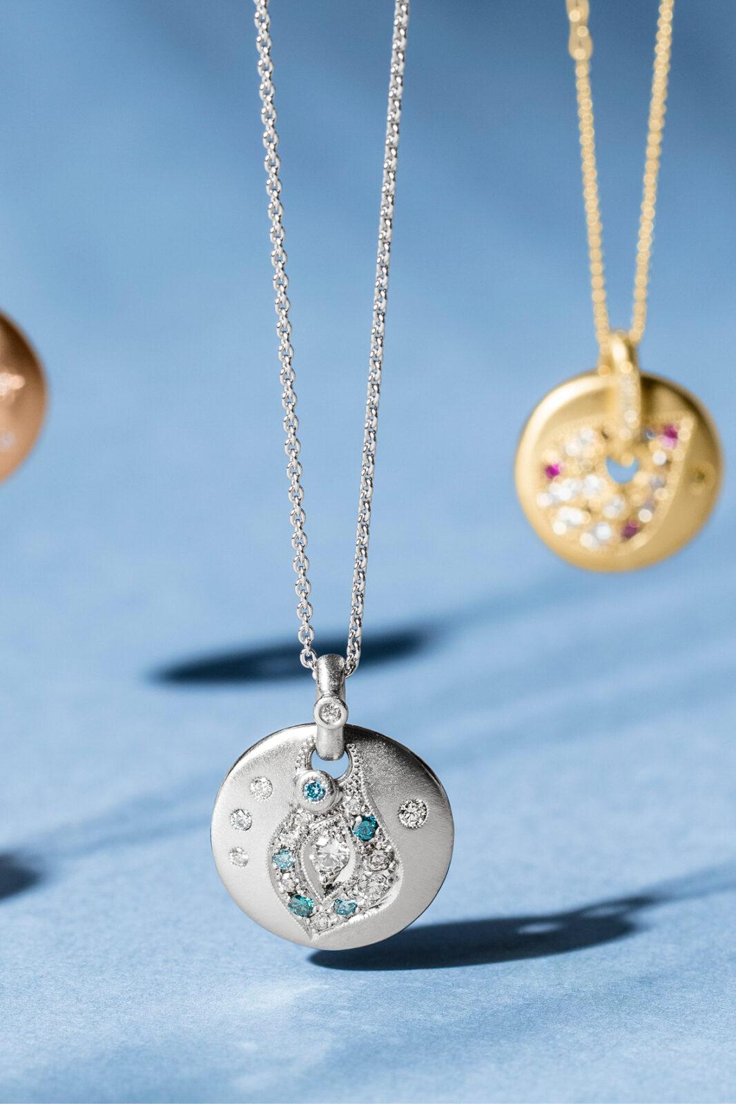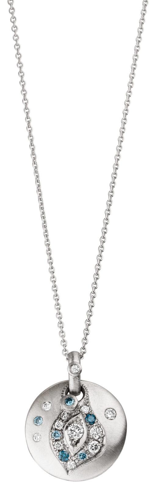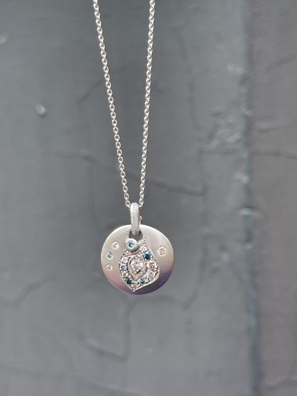 Dit is de raindrops hanger. Witgoud 14krt met blauwe en witte briljanten. Het witgoud zorgt ervoor dat de briljanten extra glinsteren zoals regen in de zon doet.