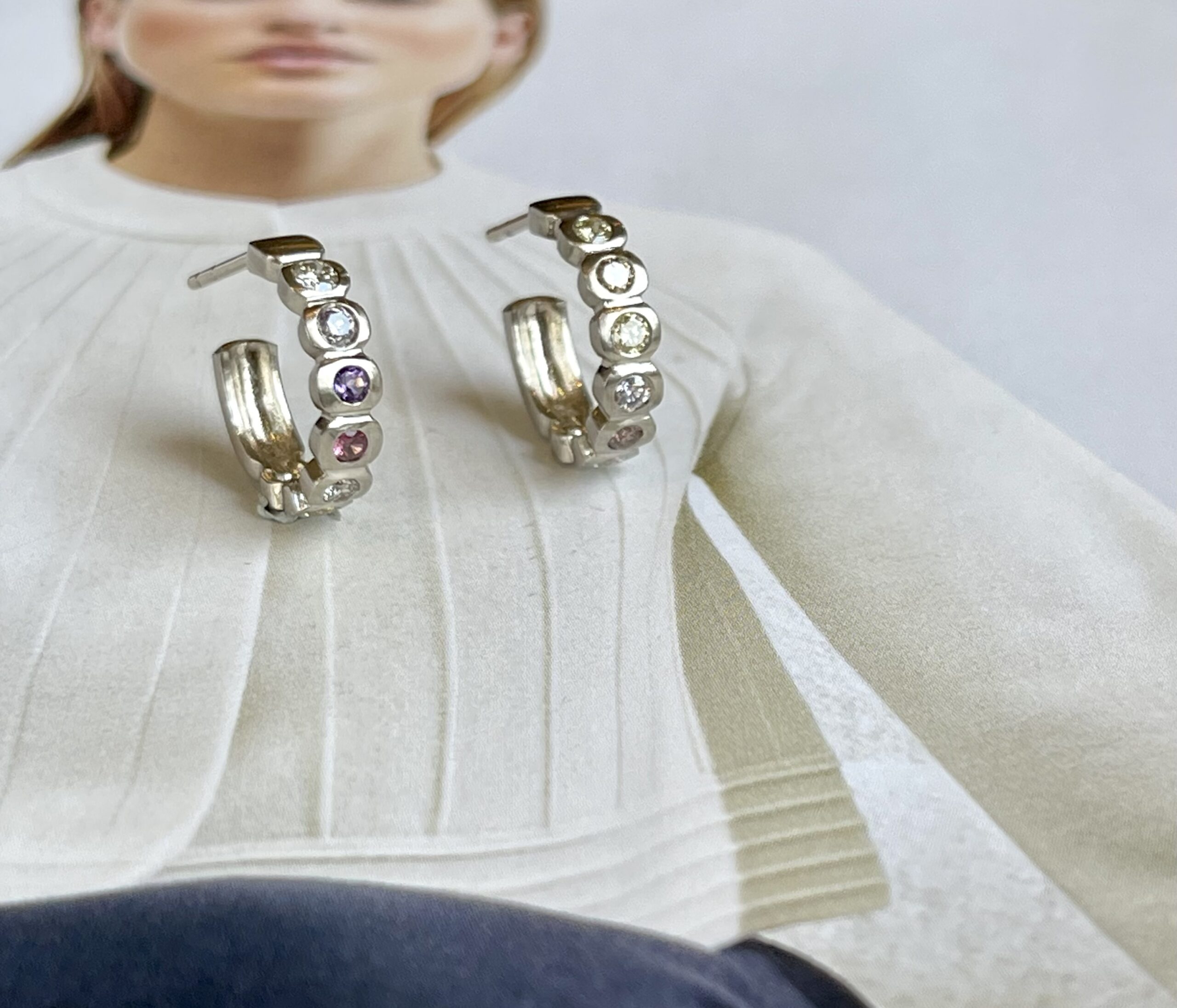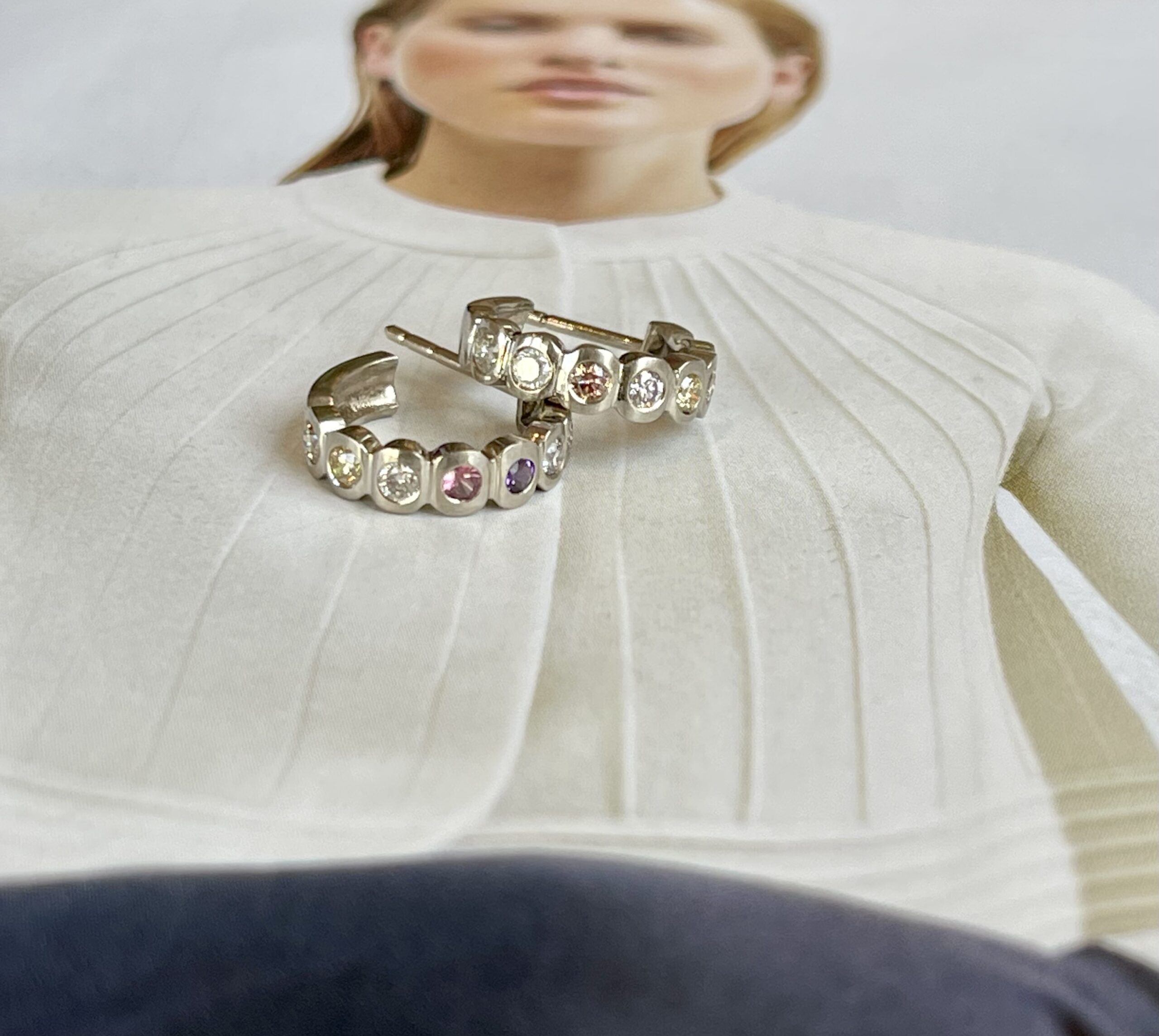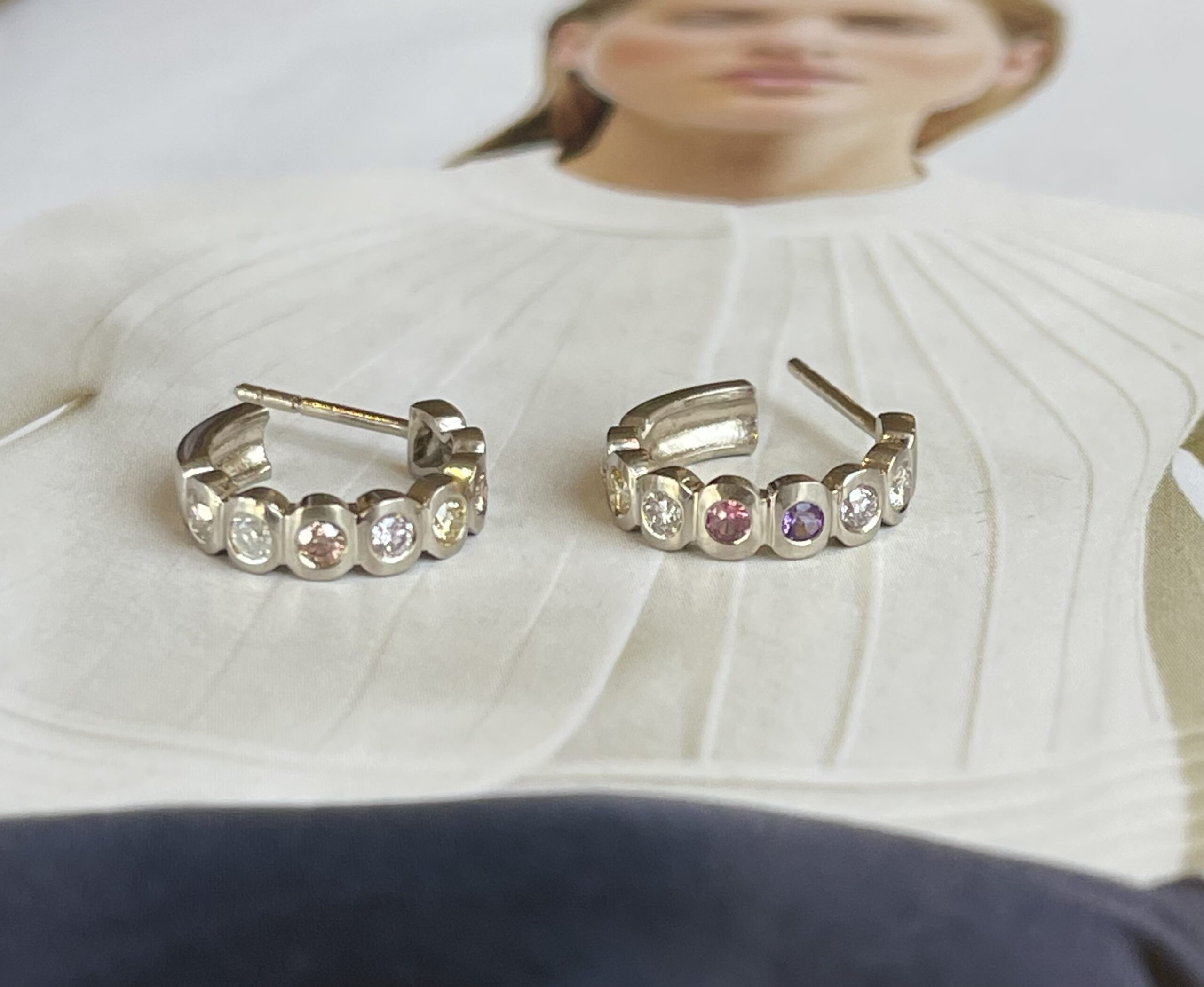 Prachtige witgouden oorbellen met verschillende fancy diamant, amethyst en roze saffier. Hoops die net even anders zijn. Dit is het laatste paar wat we nog hebben en we gaan deze Sunny day serie ook niet meer maken!
