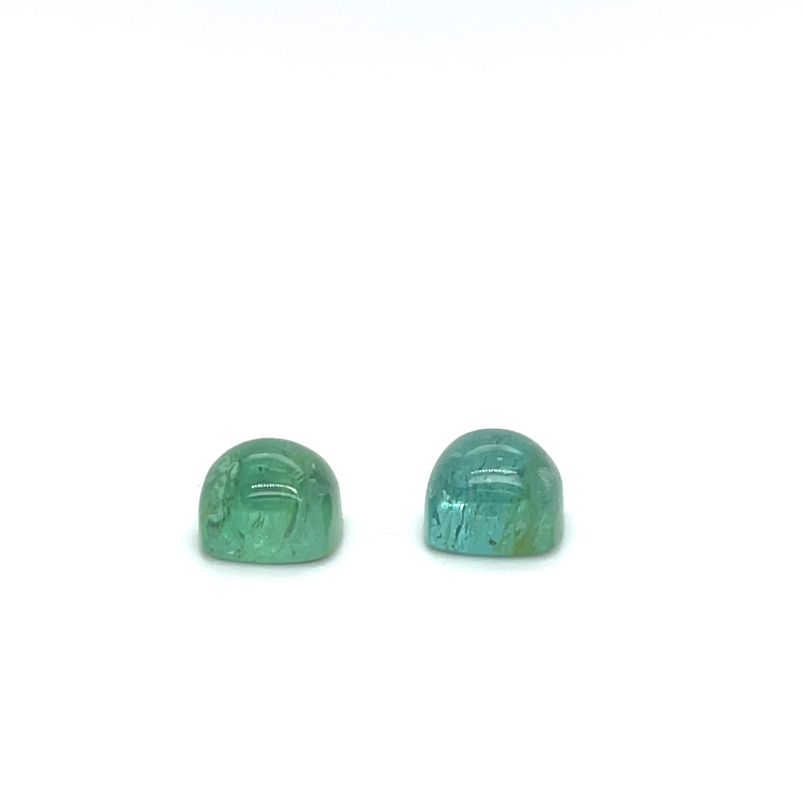 Een paartje toermalijnen van 9mm in een antik cabochon slijpsel. De toermalijnen zijn groen met een vleugje blauw erdoor heen.