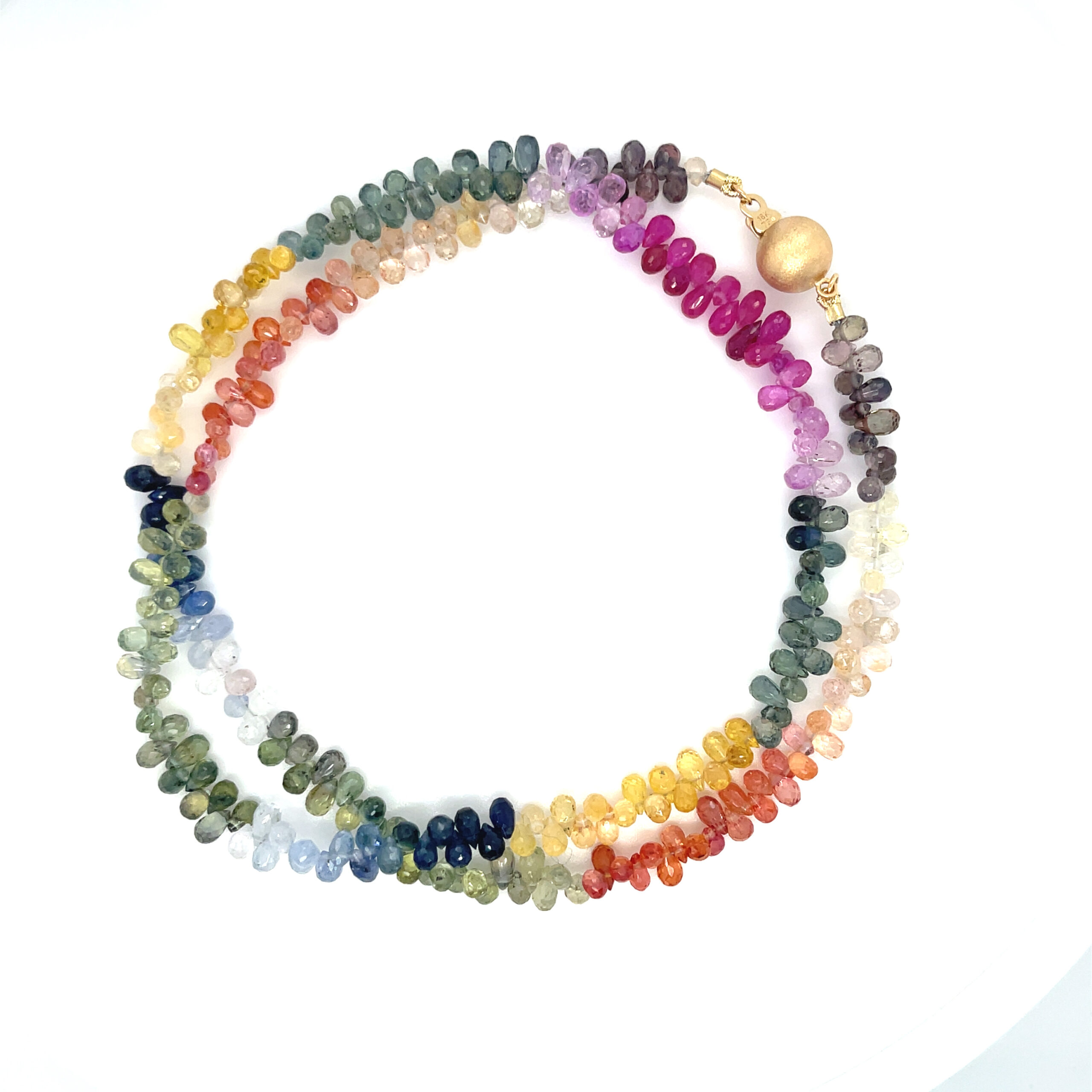 Als u van saffieren houdt, maar niet kunt kiezen welke kleur het mooiste is, dan is dit collier uitermate geschikt voor u. Dit collier bevat alle kleuren van de regenboog aan saffier. Door de speelse manier waarop de saffieren aan de ketting zijn bevestigd is dit een vrolijk collier.